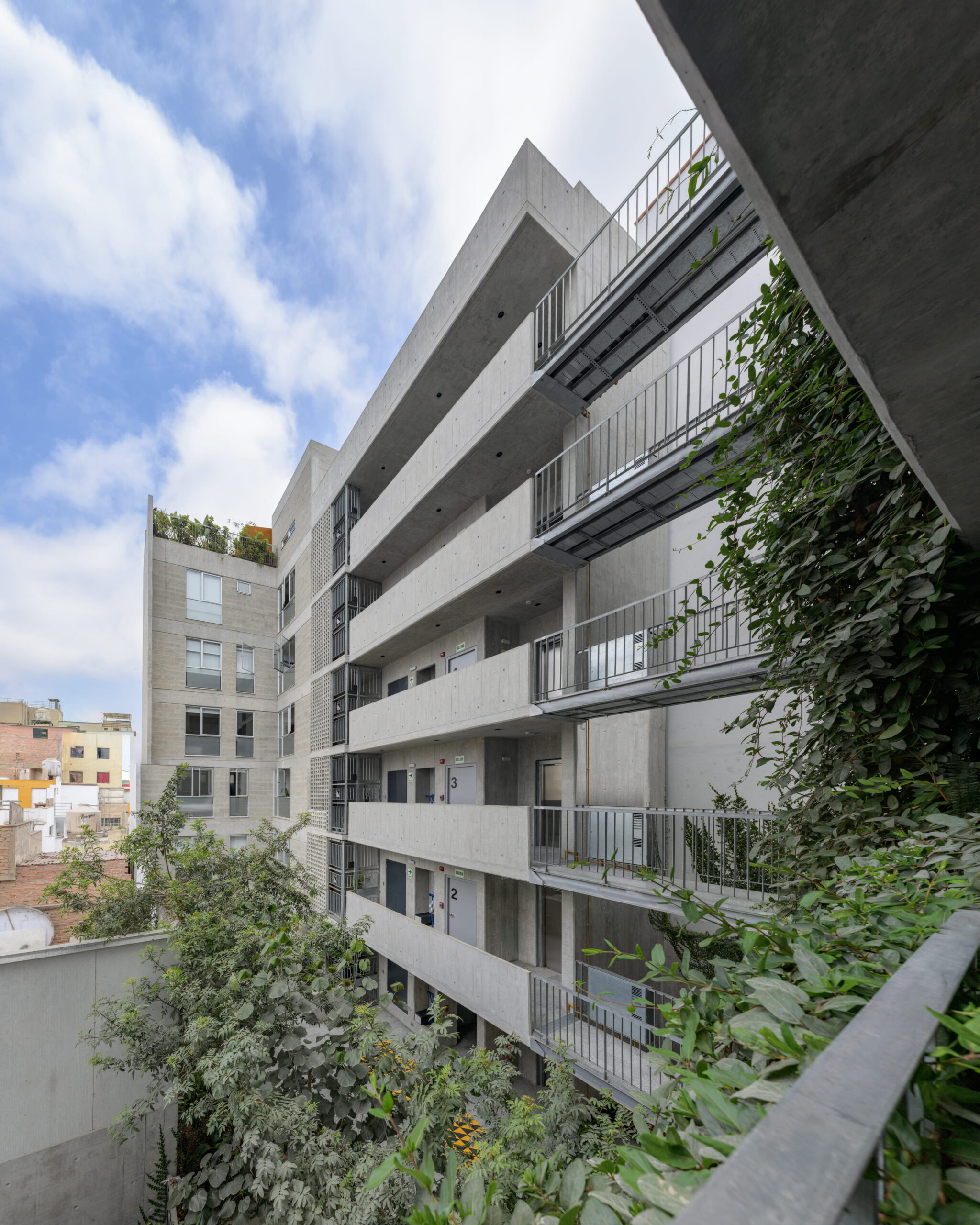El cuarto proyecto diseñado por Vicca Verde para Solar en el barrio La Viñita en Barranco recoge la experiencia de los proyectos previos ya en ocupación. Se concibe como 2 torres independientes, separadas por un patio central en T de 18m. de largo por 18m. de fondo, y conectadas mediante un núcleo central y circulaciones abiertas orientadas al norte, que se abalconan al patio central, aprovechando el sol de invierno y protegiéndose del viento sur.